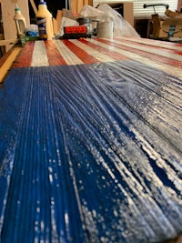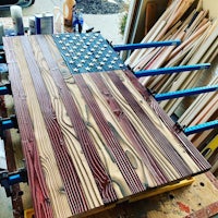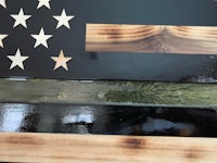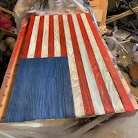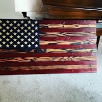 This is an American flag that was charred, then the char scraped off to create the distressed look. The color can be done either by paint or staining depending on the client. Dimensions are 4’ x 2’ but can be customized as well.
