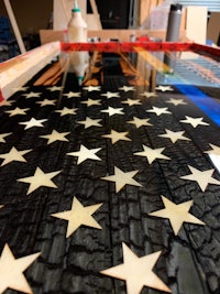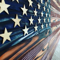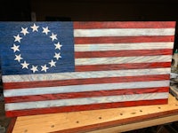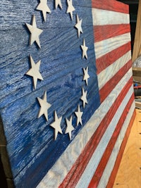 This is a Betsy Ross flag that was charred, then the char scraped off to create the distressed look. The color can be done either by paint or staining depending on the client. Dimensions are 4’ x 2’ but can be customized as well.