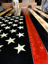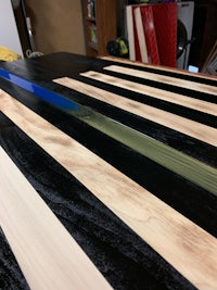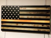This flag is made from wood and epoxy. Specifically, the “thin line” is made from epoxy and colored pigment is added depending on the customer’s request. This flag was made for a firefighter. The wood is painted to get the black lines and is sealed in polyurethane. The wood lines can be left “clean” or “distressed” by lightly burning them (shown in the photos). The thin line is backlit by LED lights than can either be plug in or battery powered. The plug in option seems to be brighter. Both options come with a remote control. I can brand names and/or numbers into the lighter lines upon request. Standard dimensions are 4’ x 2’ but can be made larger or smaller.