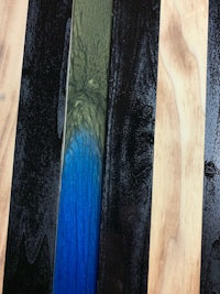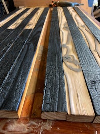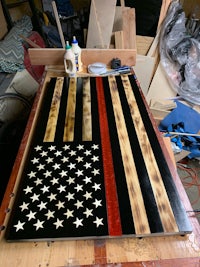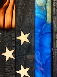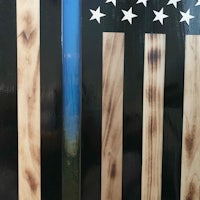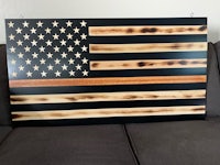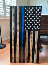This flag is made from wood and epoxy. Specifically, the “thin line” is made from epoxy and colored pigment is added depending on the customer’s request. This specific flag was made for a police officer and dispatcher husband/wife, thus the gold and blue. The wood is charred shou sugi ban style and sealed in epoxy. The thin line is backlit by LED lights than can either be plug in or battery powered. The plug in option seems to be brighter. Both options come with a remote control. The standard dimensions are 4’ x 2’ but it can be made larger or smaller.
