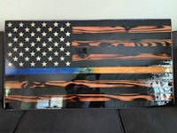This flag is made from wood and epoxy. Specifically, the “thin line” is made from epoxy and colored pigment is added depending on the customer’s request. This flag was made for a police officer. The wood is painted to get the black lines and is sealed in polyurethane. The wood lines can be left “clean” or “distressed” by lightly burning them (shown in the photos). The thin line is backlit by LED lights than can either be plug in or battery powered. The plug in option seems to be brighter. Both options come with a remote control. I can brand names and/or numbers into the lighter lines upon request. Standard dimensions are 4’ x 2’ but can be made larger or smaller.