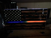 This flag is made from wood and epoxy. Specifically, the “thin line” is made from epoxy and colored pigment is added depending on the customer’s request. This flag was made for a police officer who was also in the military. The color mixtures can be whatever you’d like, for whatever reason you’d like. The wood is painted to get the black lines and is sealed in polyurethane. The wood lines can be left “clean” or “distressed” by lightly burning them (shown in the photos). The thin line is backlit by LED lights than can either be plug in or battery powered. The plug in option seems to be brighter. Both options come with a remote control. I can brand names and/or numbers into the lighter lines upon request. Standard dimensions are 4’ x 2’ but can be made larger or smaller.
