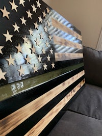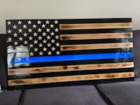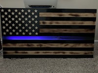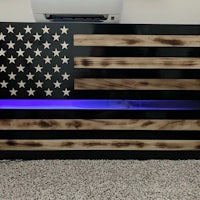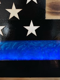 This flag is made from wood and epoxy. Specifically, the “thin line” is made from epoxy and colored pigment is added depending on the customer’s request. This flag was made for military personnel. The wood is painted to get the black lines and is sealed in polyurethane. The wood lines can be left “clean” or “distressed” by lightly burning them (shown in the photos). The thin line is backlit by LED lights than can either be plug in or battery powered. The plug in option seems to be brighter. Both options come with a remote control. I can brand names and/or numbers into the lighter lines upon request. Standard dimensions are 4’ x 2’ but can be made larger or smaller.